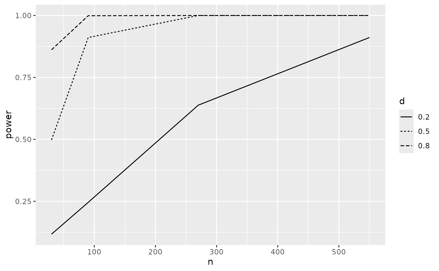 ggplot(df, aes(n, power, linetype=d)) + geom_line()