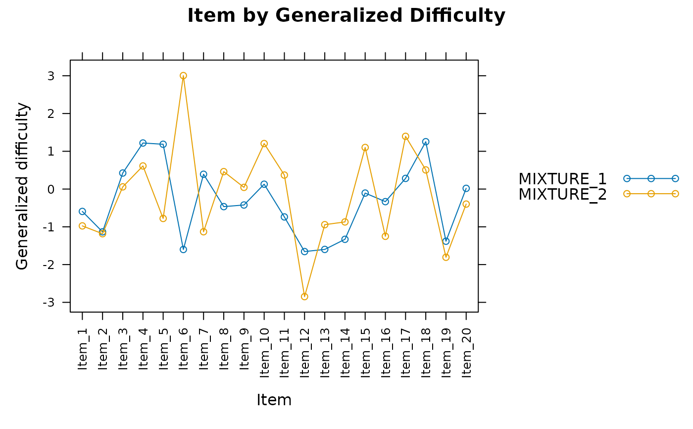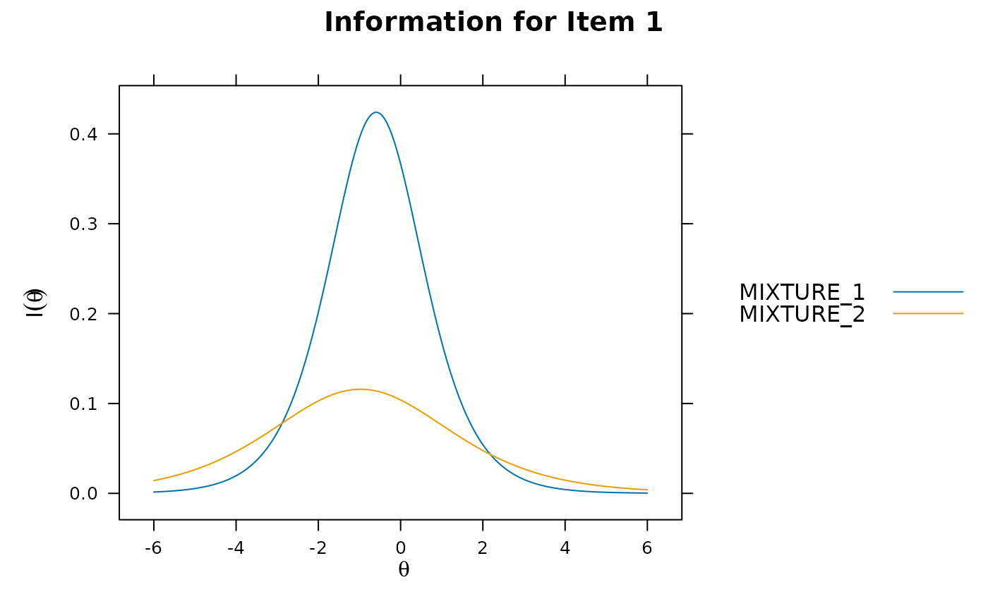 mirt, as well as'mixture-#'estimates mixtures of Gaussian distributions, where the#placeholder represents the number of potential grouping variables (e.g.,'mixture-3'will estimate 3 underlying classes). Each class is assigned the group nameMIXTURE_#, where#is the class number.Note that internally the mixture coefficients are stored as log values where the first mixture group coefficient is fixed at 0. Additionally, it is recommended to use the